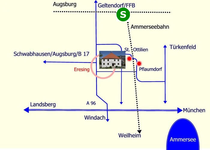 Das Gasthaus Alter Wirt steht gegenüber der Kirche St. Ulrich am Dorfplatz. Wer mit dem Zug kommt, kann an den Bahnhöfen in Geltendorf (S-Bahn) oder St. Ottilien aussteigen und zu Fuß auf schönen Wegen nach Eresing wandern (Entfernung 2 - 3 km). Außerdem liegt der Alte Wirt direkt an etlichen wunderschönen Radwanderwegen.