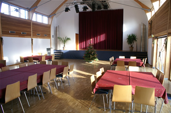 Das Dorfgemeinschaftshaus wurde von der Bauherrin - der Gemeinde Eresing - so geplant, dass es in möglichst großem Umfang über eine flexible Raumaufteilung verfügt. Wenn der Saal nicht ausreicht, wird der Raum durch das Entfernen einer Schiebetüre um das sog. Foyer (siehe rechts) erweitert.